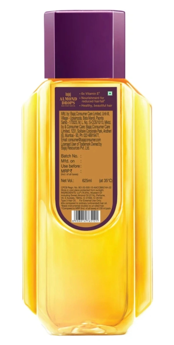 Bajaj Almond Drops Hair Oil, 625ml | 6X Vitamin E Nourishment | Light and Non-Sticky Hair Oil For Hair Fall Control