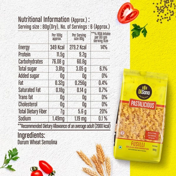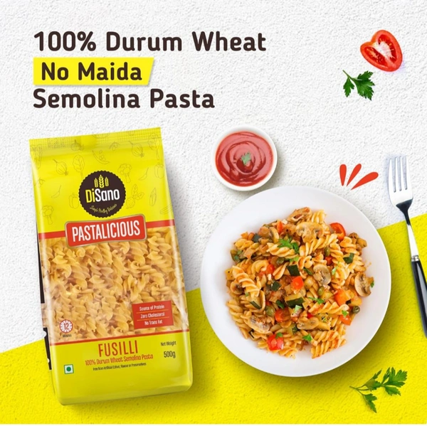 Elevate your culinary experience with DISANO Fusilli Pasta, crafted from 100% premium Durum Wheat. Perfect for health-conscious food lovers, this pasta is packed with high protein and fiber, ensuring a nutritious and satisfying meal every time. Say goodbye to unhealthy additives—this pasta contains no maida, making it a guilt-free choice for you and your family.